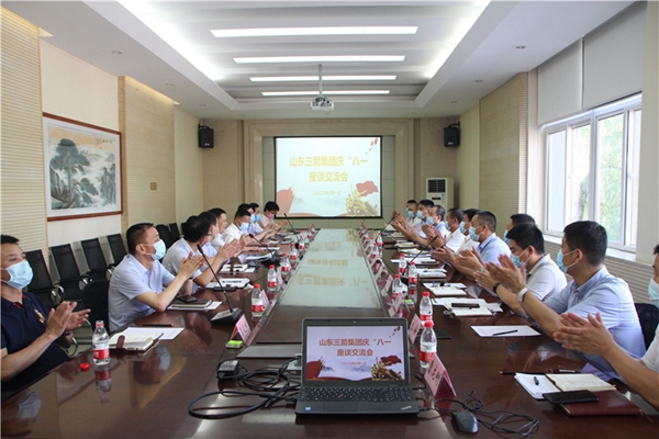 8月1日上午,為慶祝建軍93周年,山東三箭集團黨委舉辦大型慶“八一”專題活動,特邀山東省住房與建設廳二級巡視員都昌林來企業座談并作報告。三箭集團優秀軍轉干部代表、工會主席黃建華主持,集團黨委及各子公司有關領導、政工干部,全體在崗復轉軍人約150人參會。